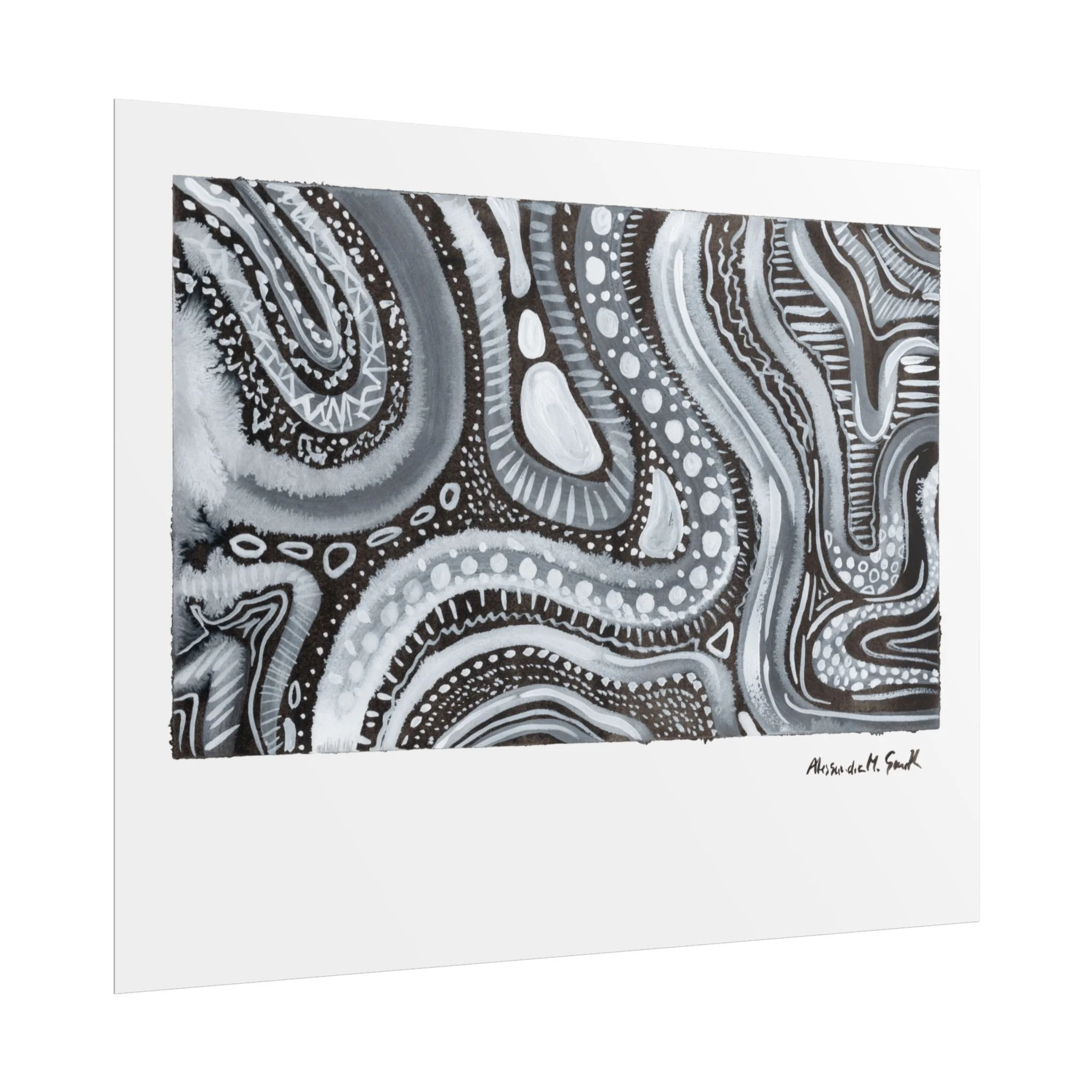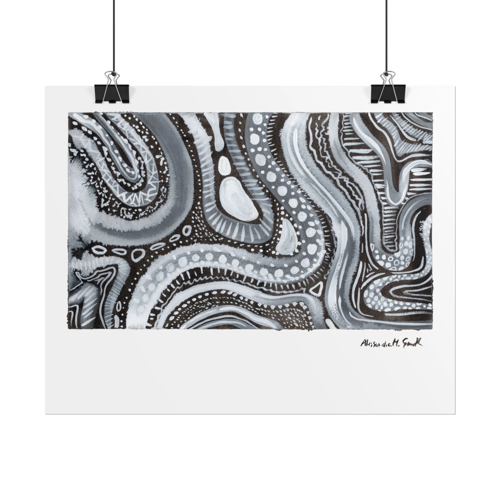 This rolled poster brings a quiet, tactile energy to your walls. The monochrome abstract print — a labyrinth of flowing lines, dots and organic shapes — reads like an ink study you could get lost in. It feels both meditative and urgent: the textured strokes suggest hand-drawn movement while the high-contrast palette keeps the piece modern and gallery-ready. Pick semi-glossy when you want sharper, more saturated blacks; or go matte for a subtle, low-reflective finish that highlights the artwork’s delicate details.